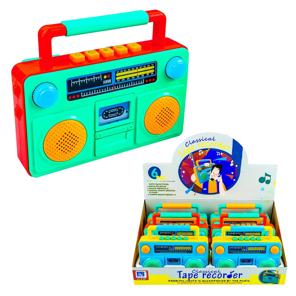 - Aspectul retro sic, cu forma dreptunghiulara si maner, precum si culorile intense vor atrage atentia copiilor. Jucaria cu imprimeu cu afisaj cu frecvente si leduri luminoase, butoane si rotite decorative si imprimeu imitativ pe fereastra casetei are antena.