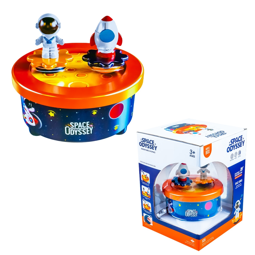 - Jucaria este realizata sub forma de cutie muzicala pe care pot fi plasate cele doua stelute, una cu figurina astronaut si cealalta cu racheta. Cutia muzicala are imprimeu cu planete, corpuri ceresti si rachete.