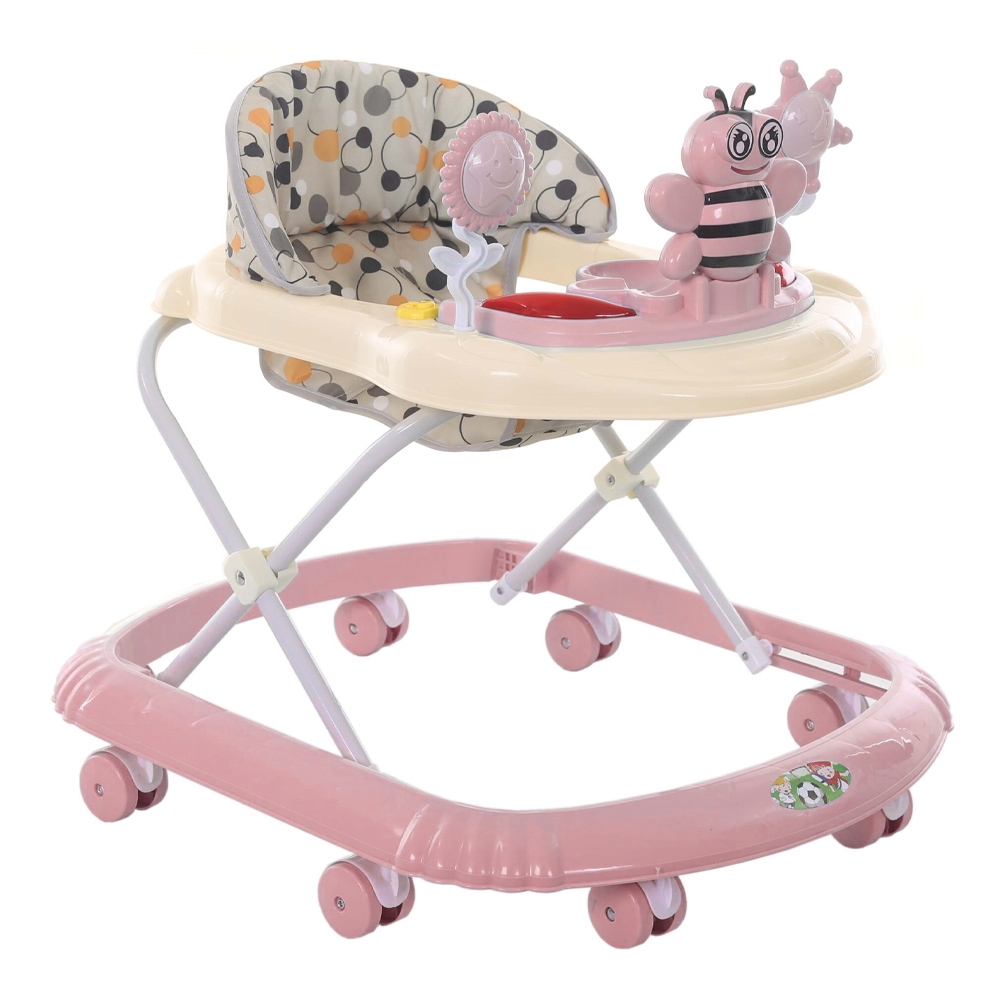 - Masuta premergatorului are un ansamblu de jucarii compus dintr-o figurina dragalasa, pliabila, in forma de albinuta, 2 flori ce au corola rotativa si 2 butoane ce declanseaza muzica ritmata si cele doua leduri colorate. Functiile de sunet si lumina necesita 2 baterii AA, 1,5V neincluse. Pentru introducerea bateriilor se rasucesc cele doua semicercuri de la colturile ansamblului jucariilor de pe masuta, detasandu-se, iar apoi bateriile se plaseaza in compartimentul bateriilor plasat sub acesta. Bateriile se introduc numai de catre adulti, in spatiul destinat, in pozitia corecta, respectandu-se polaritatea. Compartimentul bateriilor trebuie sa fie curat. Bateriile epuizate se schimba si se recicleaza conform normelor in vigoare. In cazul neutilizarii produsului pentru mai mult timp, se scot bateriile pana in momentul refolosirii. Datorita masurarii manuale a produsului poate exista o diferenta minora fata de dimensiunea reala a produsului.