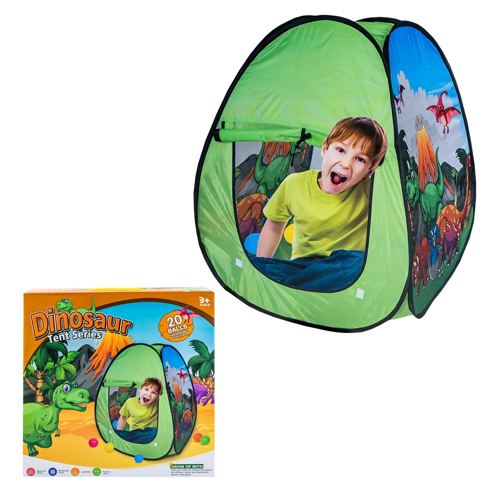 - Cortul de joaca are o forma piramidala, sistem de depliere de tip pop-up, usa de acces din poliester, una din laturi din material tip plasa, trei din laturi din poliester, cadru metalic, imprimeu cu dinozauri.