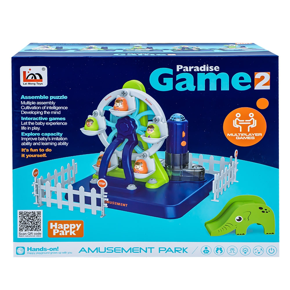 - Setul contine 51 piese de constructii cu ajutorul carora se realizeaza o roata, piesa centrala a parculetului de distractie, gardul, toboganul si surubelnita electrica.