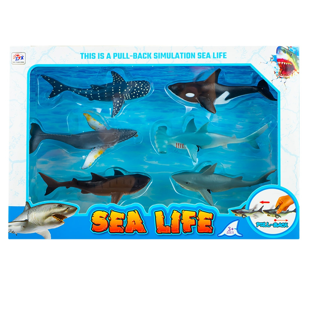 - Setul contine 6 figurine animale marine: 1 rechin balena, 1 balena ucigasa, 1 balena cu cocoasa, 1 rechin ciocan, 1 rechin, 1 rechin marele alb.