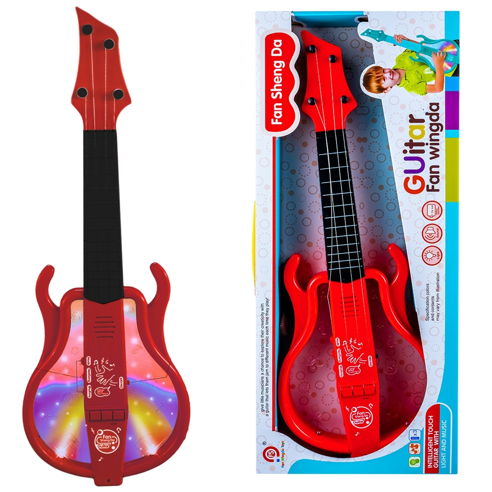 - Jucaria imita o chitara electrica avand cutia cu forma simetrica, designul colorat al partilor laterale fiind completat de fata transparenta si cele doua leduri cu lumina colorata, intermitenta, ceea ce ii face pe copii sa se simta ca adevarati rockeri. Chitara este echipata cu 4 corzi metalice ce pot fi acordate cu ajutorul cheitelor plasate pe partea din spate a capului chitarei, pentru a face sunetul mai clar. Corzile sunt bine fixate pe punte pentru a reda notele muzicale intr-un mod placut. Pe gatul chitarei sunt 12 benzi. Functionand cu baterii, chitara are 3 butoane ce declanseaza functii muzicale: 17 ritmuri, 13 melodii, schimbarea modului de redare curent.