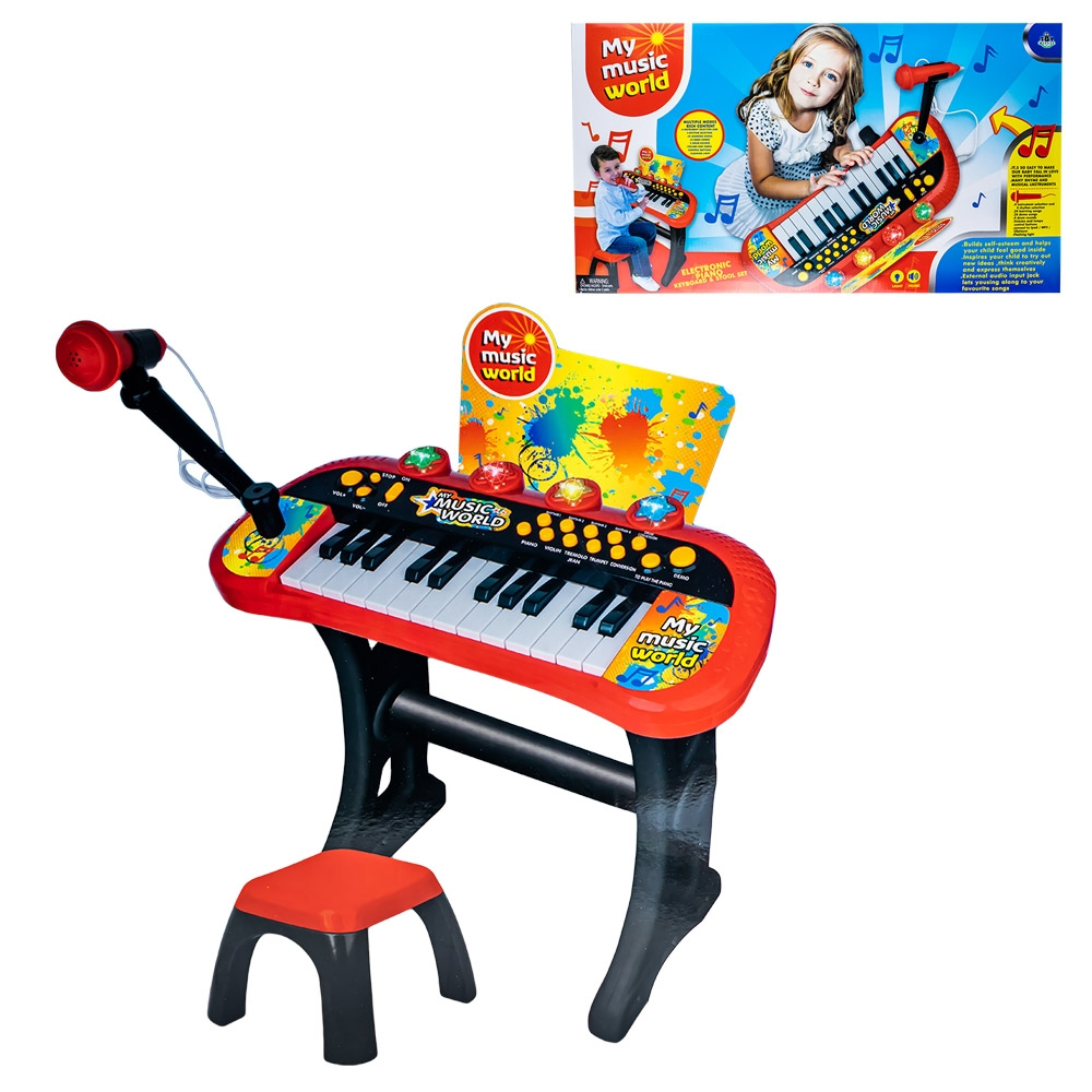 - Setul muzical, ideal pentru copii care iubesc de mici muzica, contine: 1 orga electronica, 1 scaunel, 1 cablu 2xjack, 1 microfon cu suport.