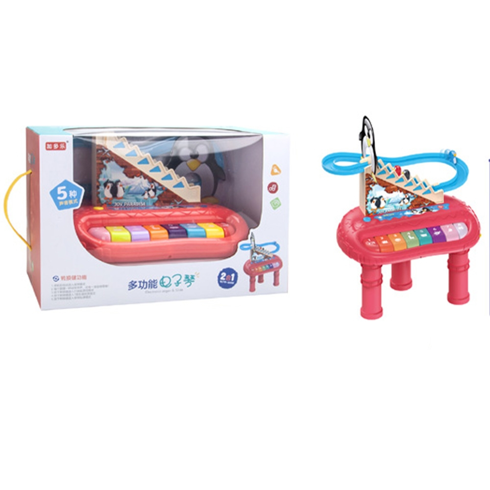 Pianul 2 in 1, de jucarie, cu baterii, incurajeaza dezvoltarea simtului muzical si a dexteritatii si este distractiv prin scara inclusa.