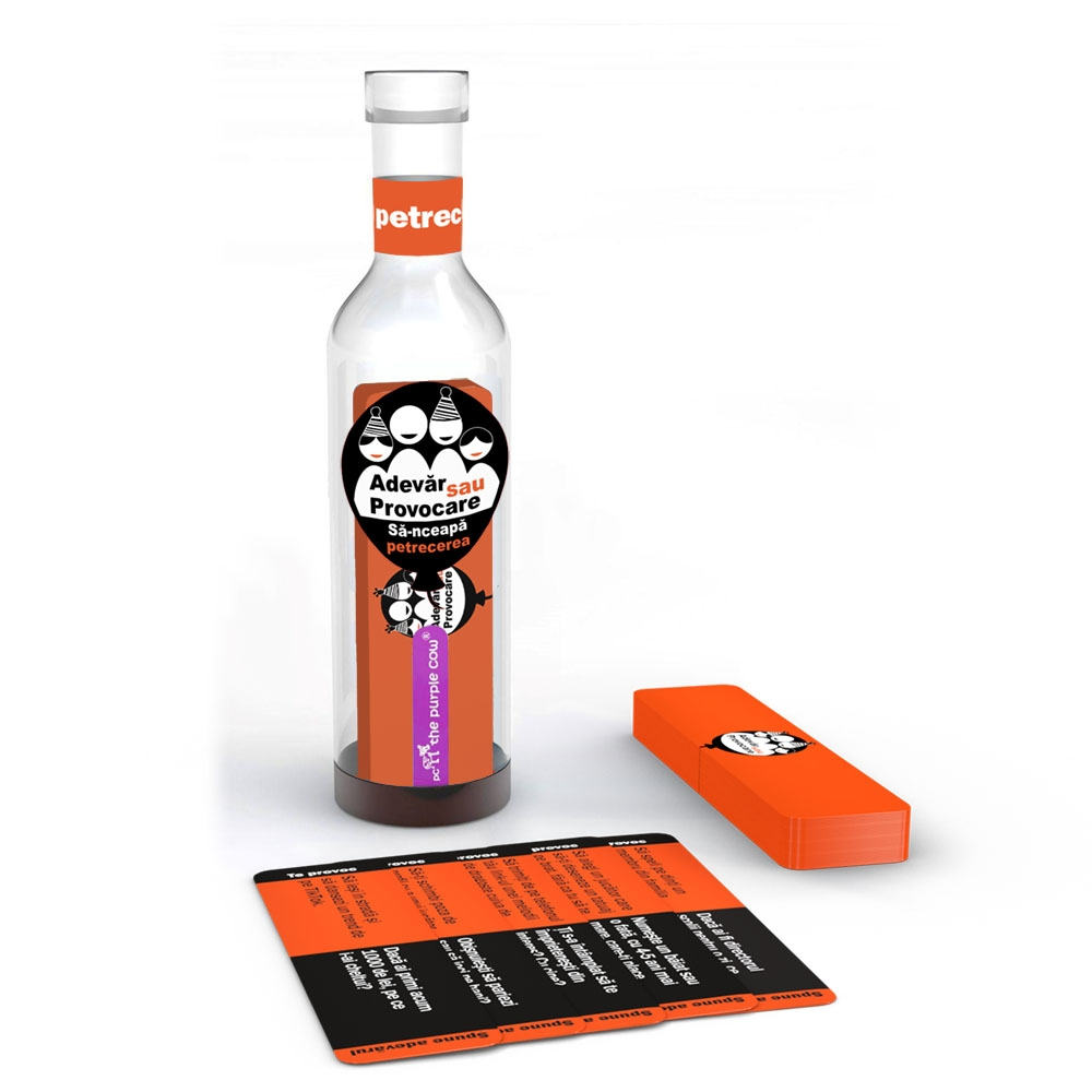 - Mod de joc: asezati-va intr-un cerc in jurul unei mese. Amestecati cartile de joc si asezati-le pe masa cu fata in jos. Cel mai scund jucator va invarti primul sticla. Odata ce sticla se opreste, jucatorul care a rotit sticla trage o carte din partea de sus a teancului si intreaba jucatorul spre care este indreptat varful sticlei "Adevar sau provocare?". Daca se alege varianta raspunsului acesta trebuie sa fie sincer, iar daca se alege provocarea trebuie sa fie indeplinita in intregime. Dupa ce realizeaza cerintele jucatorul indicat de sticla are dreptul sa invarta sticla in runda urmatoare.