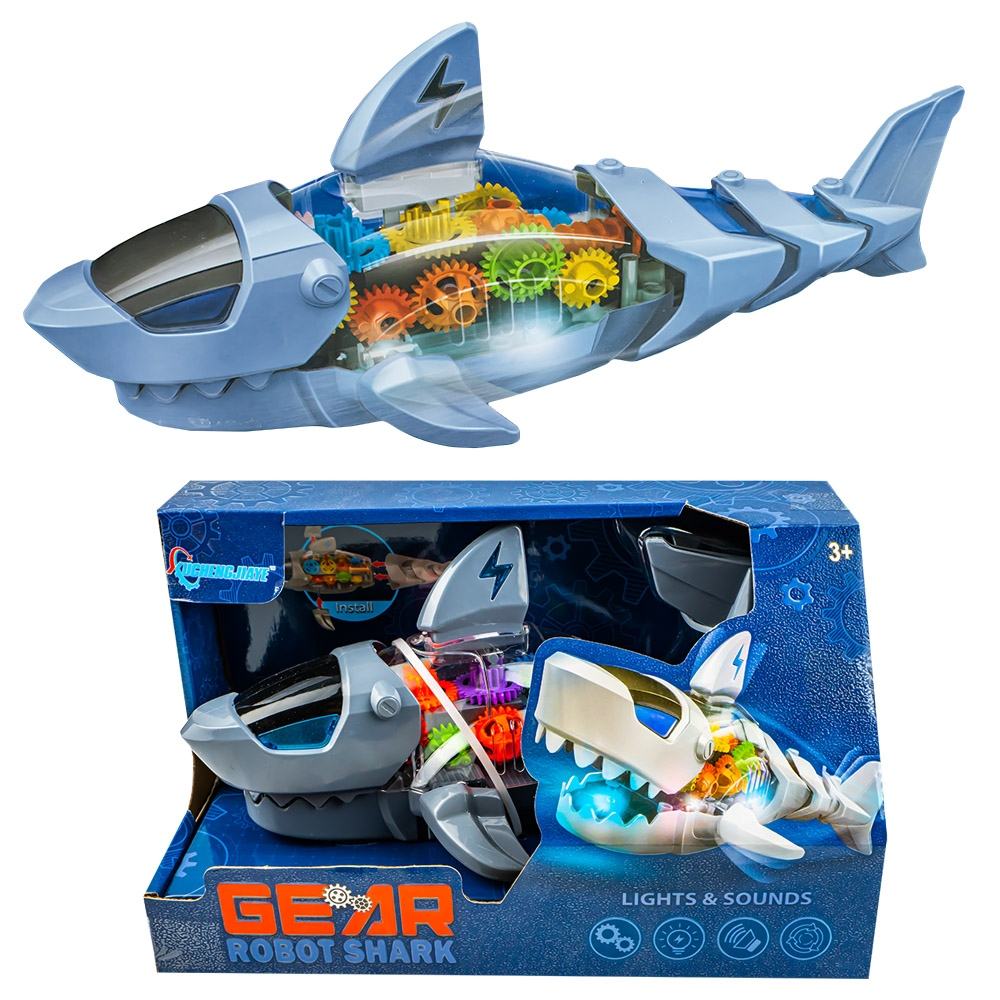 - Jucaria are forma de rechin cu carcasa transparenta si interior multicolor.