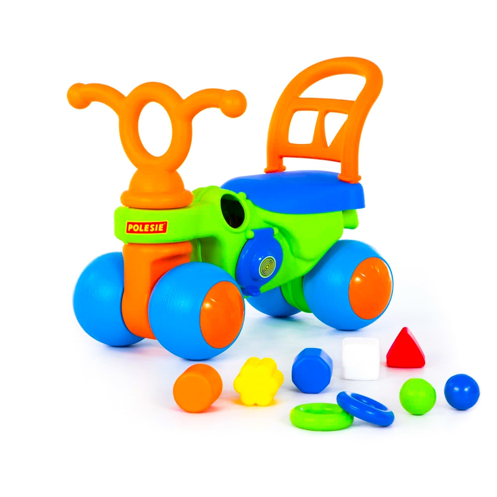 - Bicicleta este echipata cu patru roti late sferice, din plastic si un spatar inalt, care permite copilului sa se deplaseze in siguranta, impingand cu picioarele.