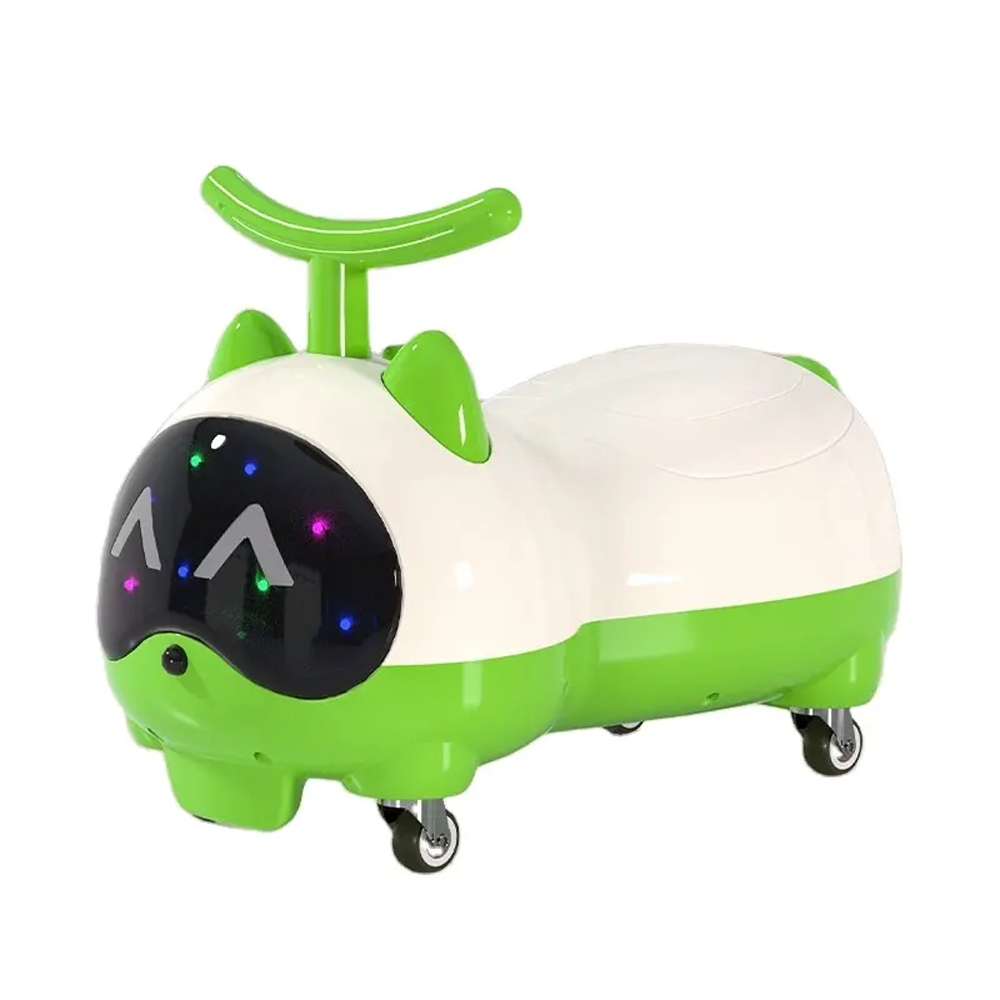 - Aceasta este echipata cu 4 roti din cauciuc, ce asigura rotirea libera la 360o, ghidon pentru sprijinire, muzica si lumini.
