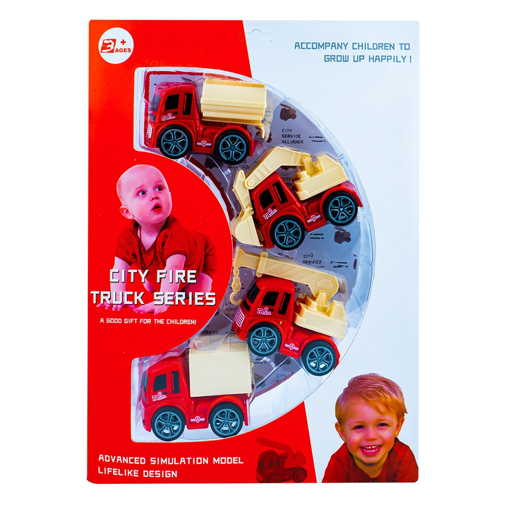 - Setul contine 4 masinute pompieri: 1 betoniera, 1 camion cu scara, 1 basculanta, 1 camion cu container.