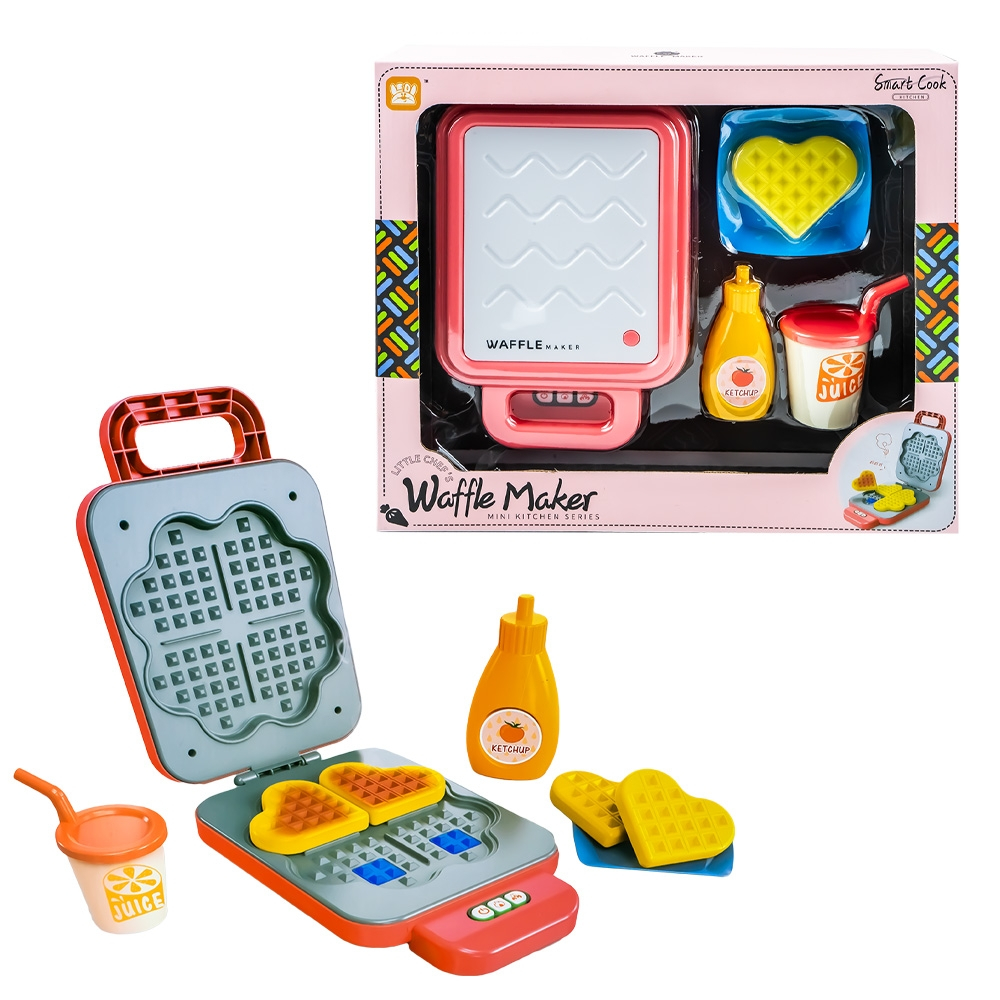 - Setul contine tot ce este necesar ca cei mici sa realizeze un joc atractiv de preparare de vafe: 1 aparat de gofre, 4 vafe cu forma de inimioara, 1 farfurie, 1 sticla de ketchup, 1 pahar pentru suc.