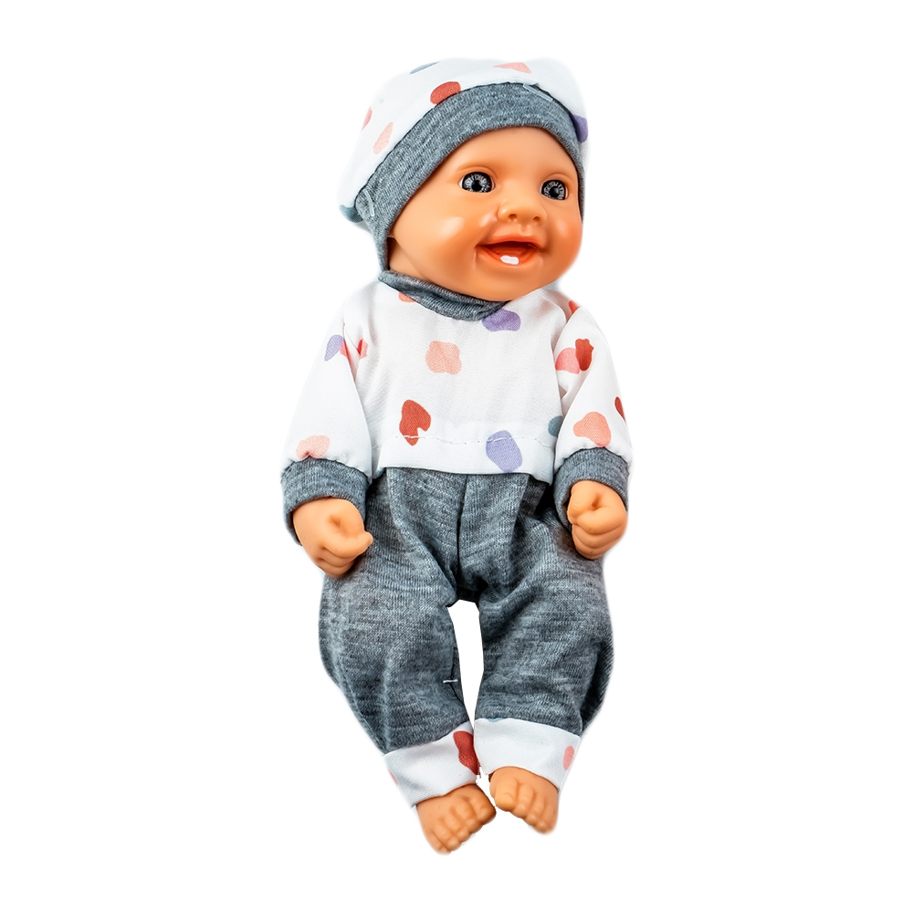- Aceasta este imbracata intr-o salopeta eleganta, iar pe cap are o caciulita asortata. Salopeta papusii este usor de manipulat, avand inchidere cu scai.