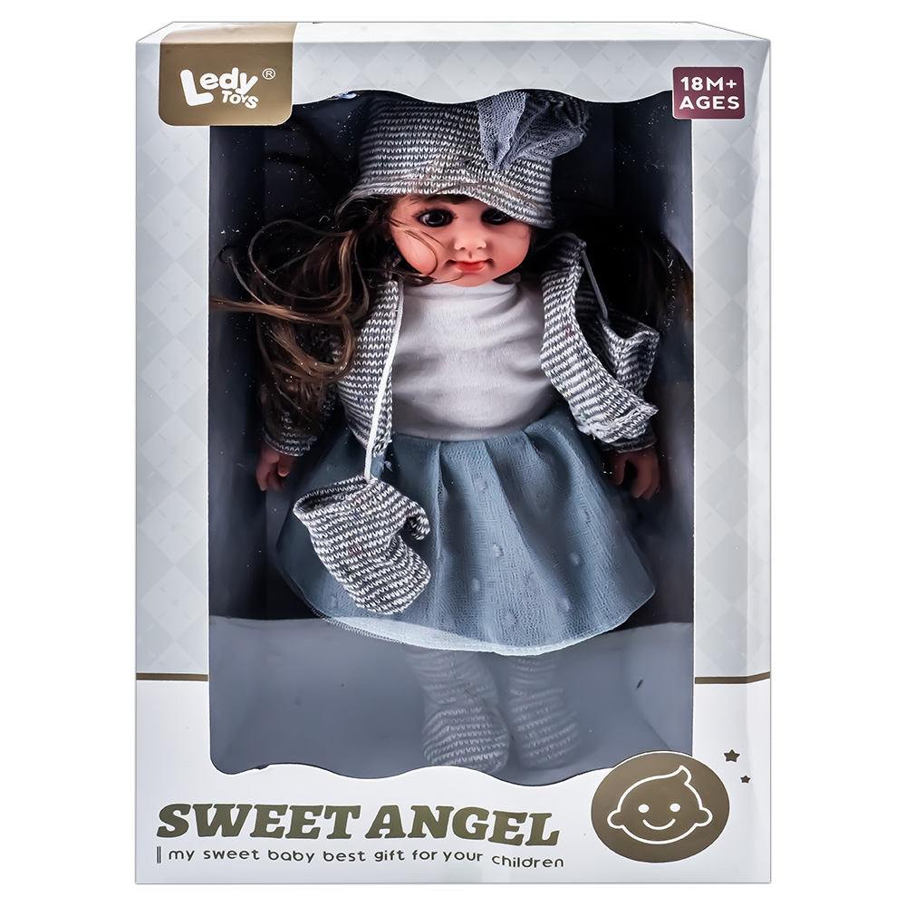 - Papusa este imbracata intr-un costumas asortat format din sarafan, puloveras, caciula, botosei si manusi. Sarafanul este usor de manipulat, avand inchidere cu scai.