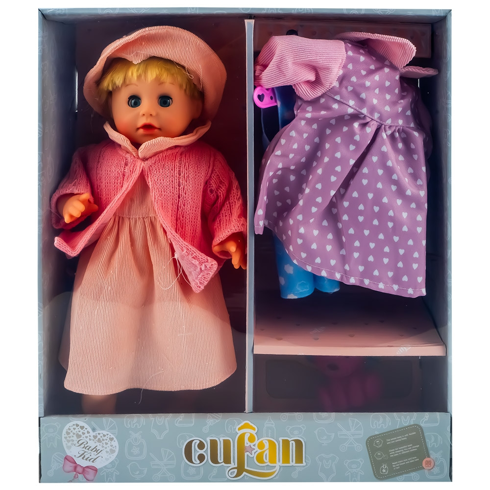 - Papusa cu functie muzicala are capul si membrele din plastic, iar corpul din material textil. Hainele sunt detasabile. Ochii papusii se inchid. Functia de sunet necesita 3 baterii AG13, incluse.