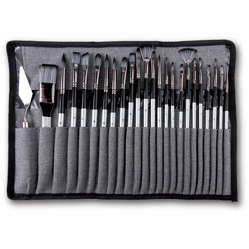 - Setul contine 23 pensule de diferite marimi, 1 spatula si 1 husa de protectie.