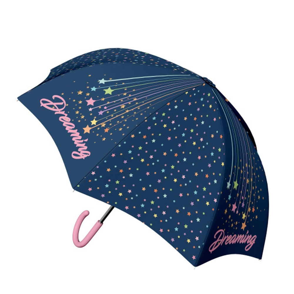 - Umbrela pentru fete este confectionata din poliester imprimat cu stelute, motiv DREAMING. Cadrul si cele 8 spite sunt din metal.