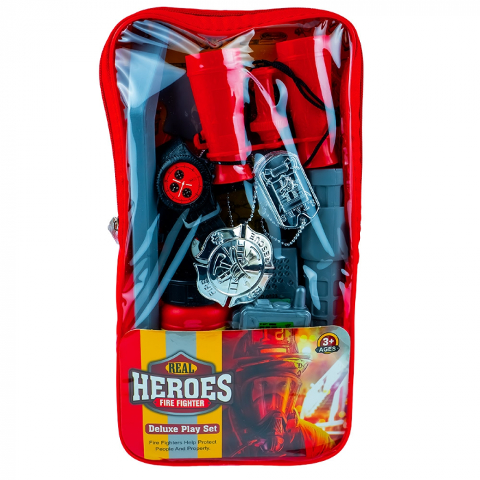 - Setul contine o multime de intrumente de joc pentru un mic pompier in devenire: 1 extinctor, 1 insigna, 1 set de placute de identificare, 1 binoclu, 1 ceas, 1 statie emisie-receptie, 1 lanterna, 1 levier, 1 detector de gaze, 1 topor.