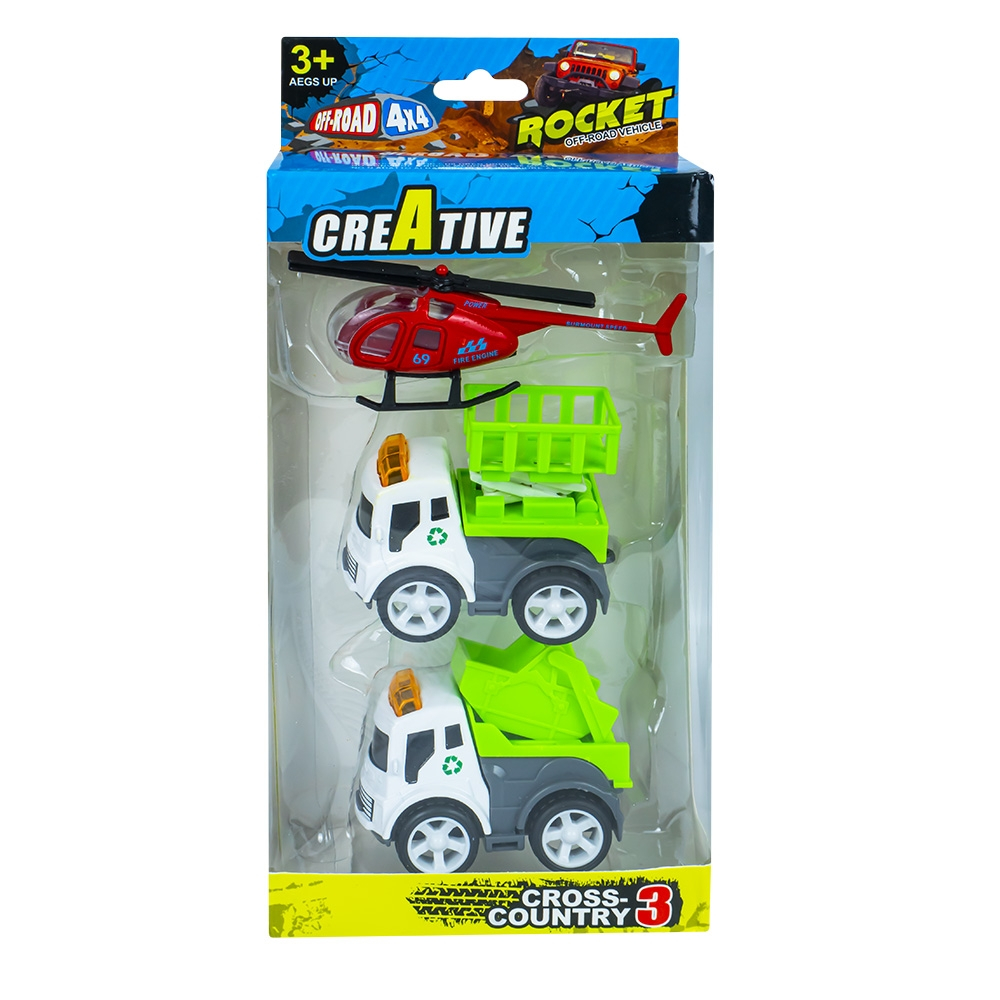 Dimensiuni vehicule: camion cu container 6.5x4.6x5.8 cm, camion u nacela 6.3x6x4.4 cm, elicopter, 10x4x2.5 cm