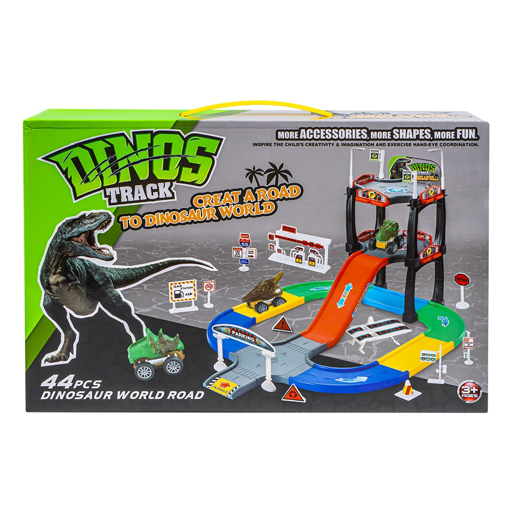 - Setul contine: 2 masinute dinozaur, 3 piese parcare, 7 balustrade, 1 piesa rampa, 3 piese drepte de pista , 4 piese curbe de pista, 1 piesa capat de pista, 1 piesa pista dreapta scurta, 4 perechi de stalpi de sustinere, 1 statie de alimentare combustibil cu 2 pompe, 2 jaloane, 7 indicatoare, 2 triunghiuri, 1 rampa, 2 picioare fixare rampa, 2 semafoare, 1 indicator parcare, 2 baze pentru fixare indicator parcare, 2 stalpi iluminat, 4 folii cu autocolante.
