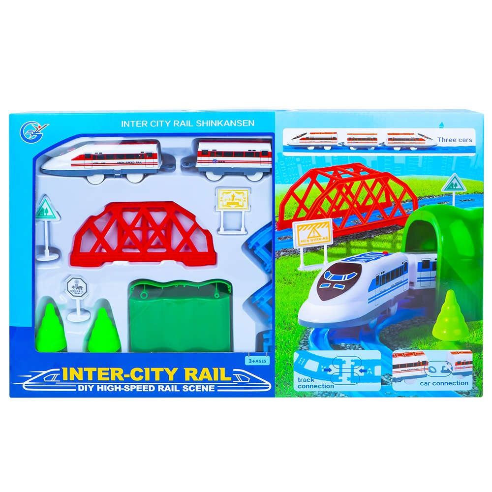 - Setul include: 1 tren inter-city cu 2 locomotive si un vagon de pasageri, 8 bucati de sina curbe, 5 bucati de sina drepte, 2 pomisori, 3 piese ce formeaza un pod, 2 piese ce alcatuiesc un tunel, 4 indicatoare.